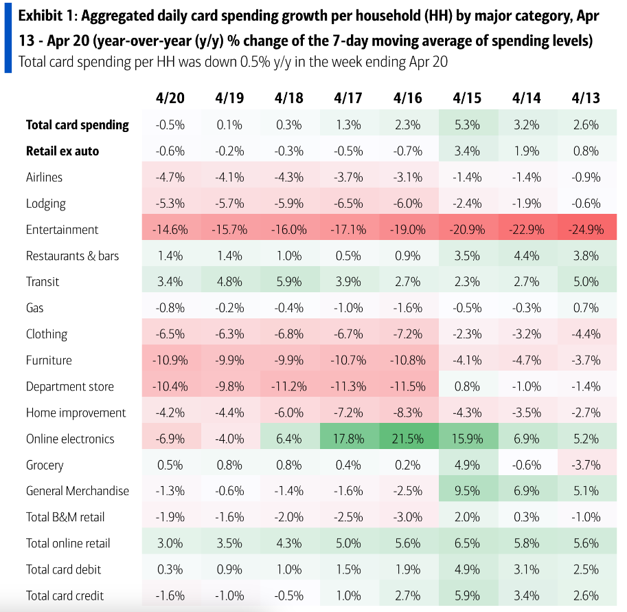 None of these trends are new to you as readers of these letters. Amazon continues to become the “toll booth” of eCommerce and now own nearly 40% of eCommerce. Recent credit card spending data from Bank of America illustrates weakness in all categories but Restaurants & Bars and Transit as Andy Jassy gave us his blunt statements of “discretionary is difficult” and “customers are trading down on average selling price.”